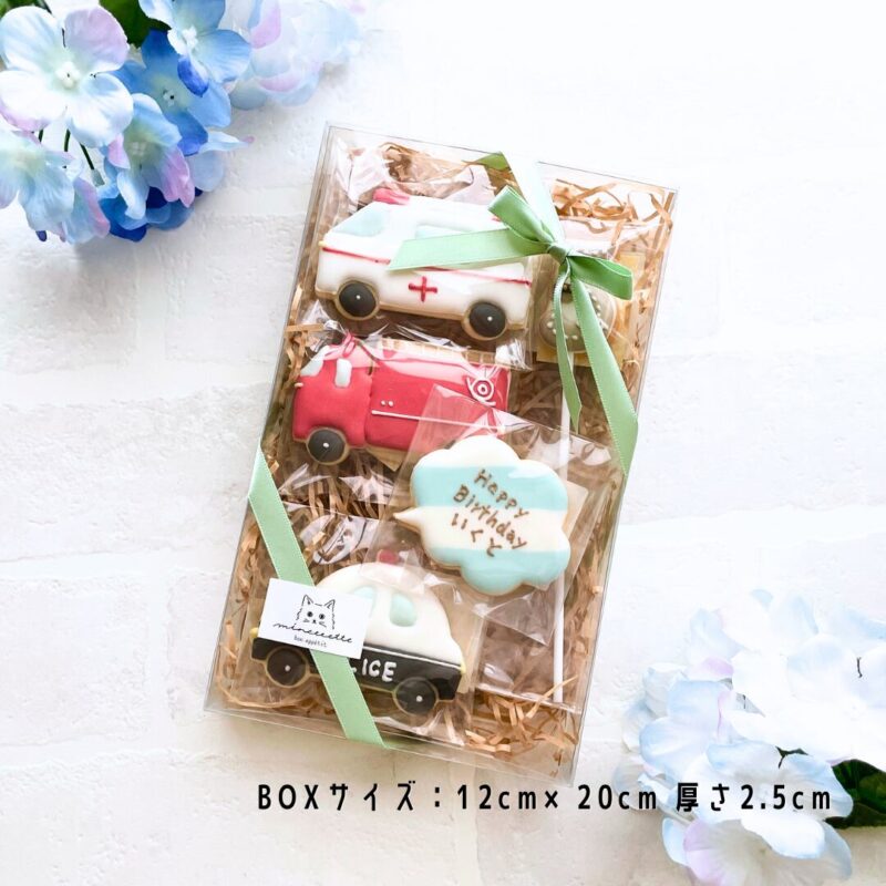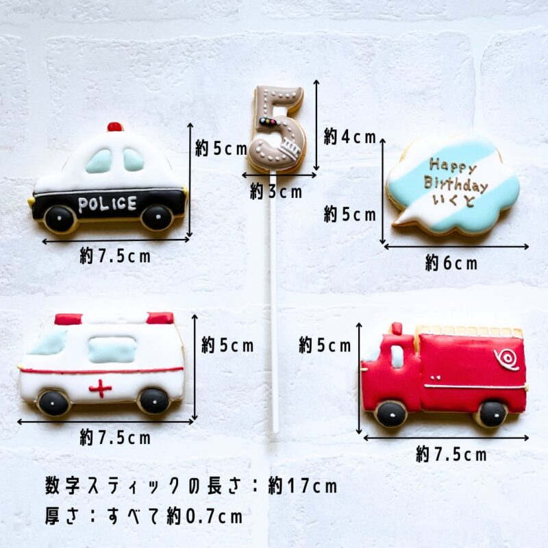 | 内容 | ・パトカー:約7.5cm×5cm ・救急車:約7.5cm×5cm ・消防車:約7.5cm×5cm ・ふきだしメッセージプレート:約6cm×5cm ・数字スティック:約3cm×4cm ・BOXサイズ:12cm×20cm 厚さ2.5cm |