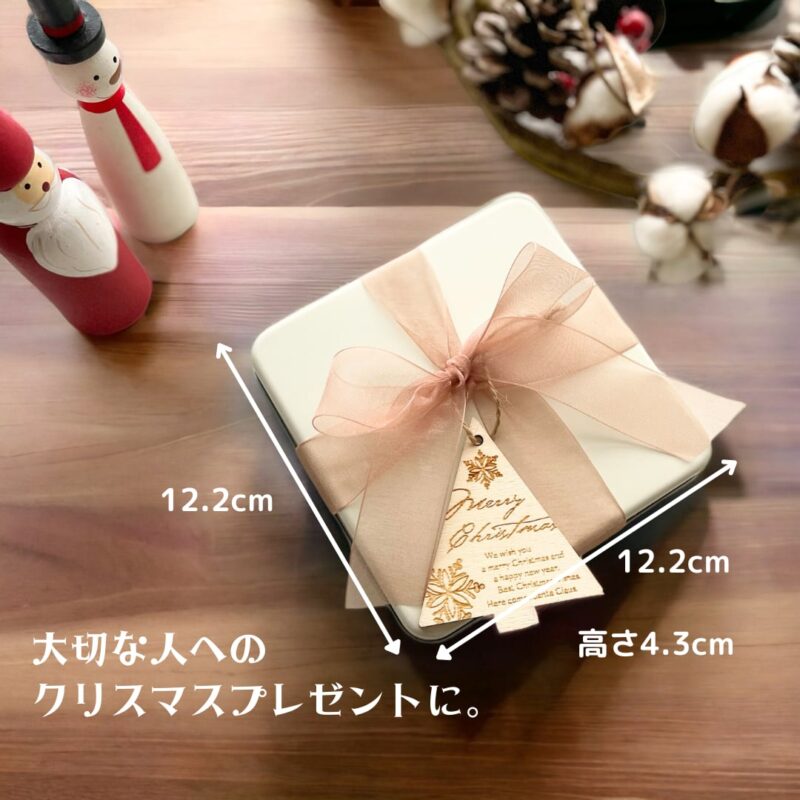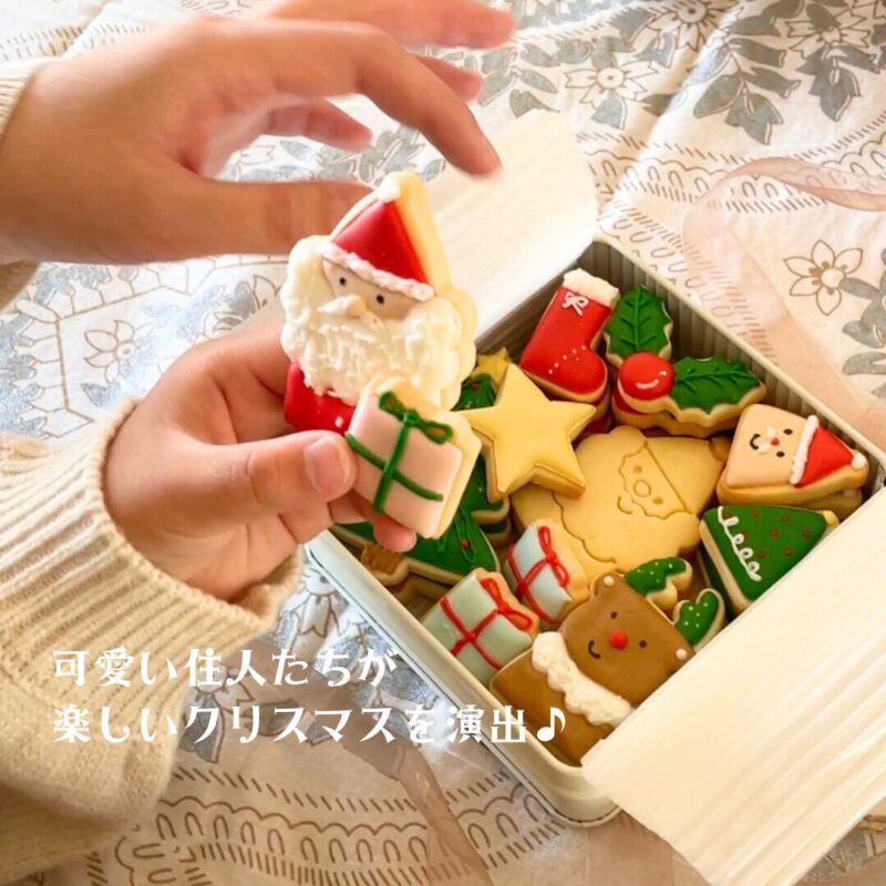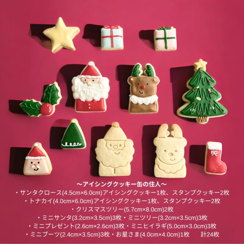 | 内容 | ・サンタクロース(4.5cm×6.0cm)アイシングクッキー1枚、スタンプクッキー2枚 ・トナカイ(4.0cm×6.0cm)アイシングクッキー1枚、スタンプクッキー2枚 ・クリスマスツリー(5.7cm×8.0cm)2枚 ・ミニサンタ(3.2cm×3.5cm)3枚 ・ミニツリー(3.2cm×3.5cm)3枚 ・ミニプレゼント(2.6cm×2.6cm)3枚 ・ミニヒイラギ(5.0cm×3.0cm)3枚 ・ミニブーツ(2.4cm×3.5cm)3枚 ・お星さま(4.0cm×4.0cm)1枚 計24枚 缶サイズ:横12.2cm×縦12.2cm×高さ4.3cm ◆一枚一枚丁寧に作らせていただきますが、手作りの為、デザインや色に少し違いが生じることがあります。ご了承ください。 |