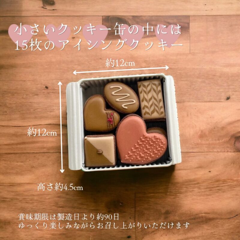 | 内容 | ・大きめハートアイシングクッキー 3枚 ・ミニハートアイシングクッキー 3枚 ・チョコレート風アイシングクッキー 3種 各3枚 計15枚 ミニ缶サイズ:12cm×12cm×H4.5cm ◆贈答用の個別ラッピングは行っておりません。ご了承ください。 ◆一枚一枚丁寧に作らせていただきますが、手作りの為、デザインや色に少し違いが生じることがあります。ご了承ください。 |