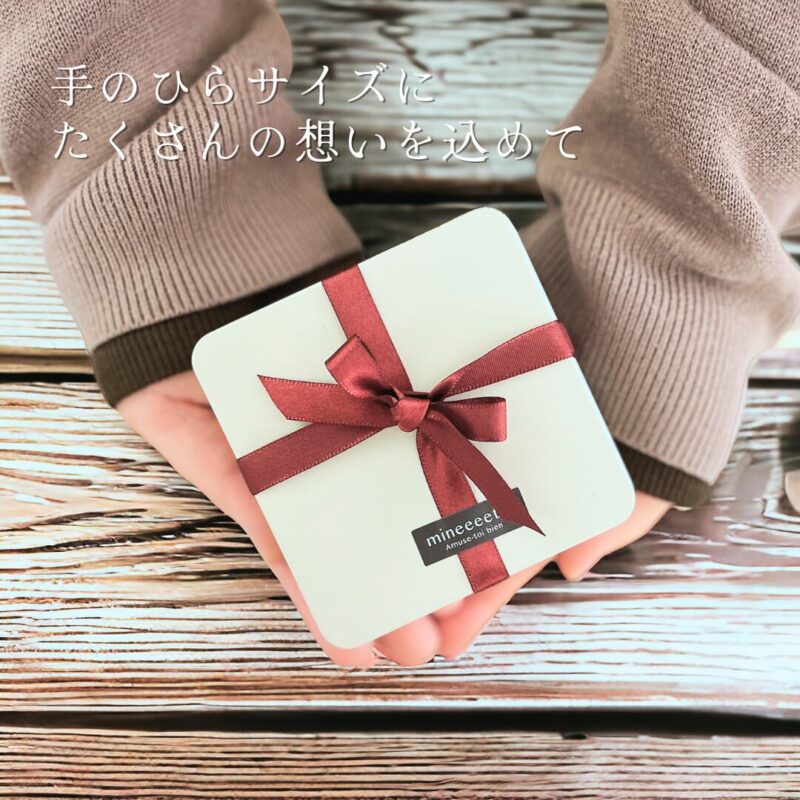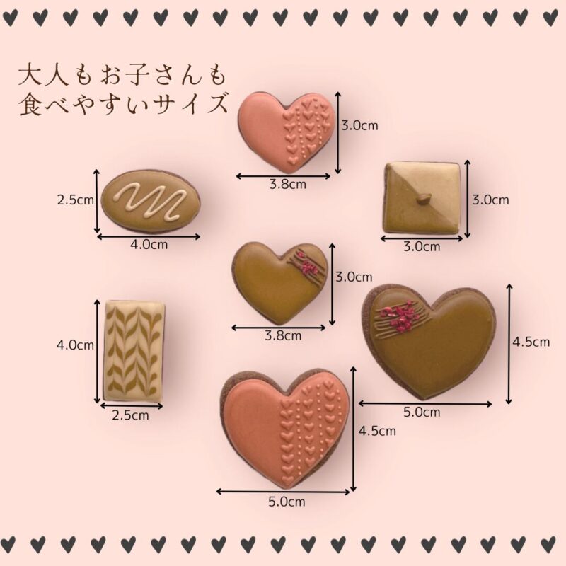 | 内容 | ・大きめハートアイシングクッキー 3枚 ・ミニハートアイシングクッキー 3枚 ・チョコレート風アイシングクッキー 3種 各3枚 計15枚 ミニ缶サイズ:89×89×H40mm ◆贈答用の個別ラッピングは行っておりません。ご了承ください。 ◆一枚一枚丁寧に作らせていただきますが、手作りの為、デザインや色に少し違いが生じることがあります。ご了承ください。 |