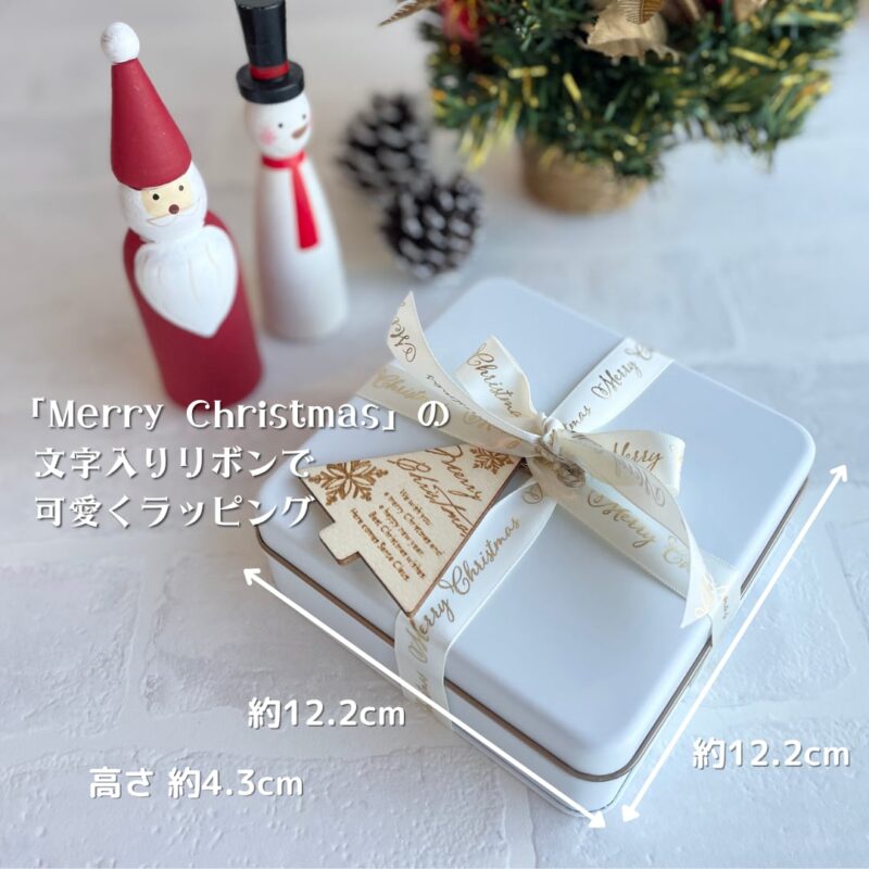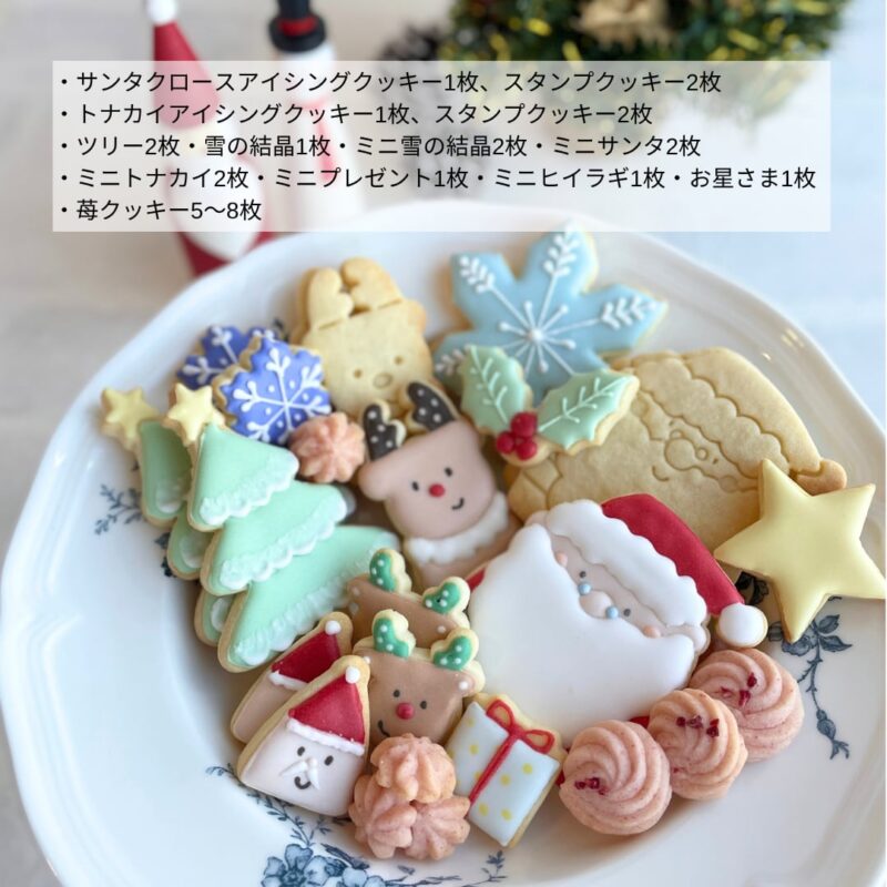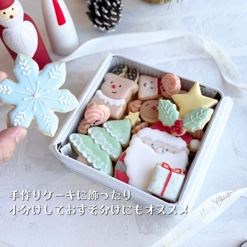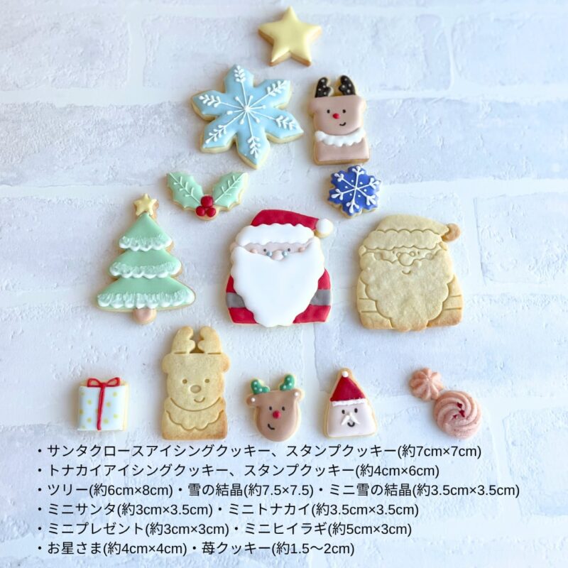 | 内容 | ・サンタクロースアイシングクッキー1枚、スタンプクッキー2枚(約7cm×7cm) ・トナカイアイシングクッキー1枚、スタンプクッキー2枚(約4cm×6cm) ・ツリー2枚(約6cm×8cm) ・雪の結晶1枚(約7.5cm×7.5cm) ・ミニ雪の結晶2枚(約3.5cm×3.5cm) ・ミニサンタ2枚(約3cm×3.5cm) ・ミニトナカイ2枚(約3.5cm×3.5cm) ・ミニプレゼント1枚(約3cm×3cm) ・ミニヒイラギ1枚(約5cm×3cm) ・お星さま1枚(約4cm×4cm) ・苺クッキー5〜8枚(約1.5〜2cm) (一枚一枚丁寧に作らせていただきますが、手作りの為、デザインや色に少し違いが生じることがあります。ご了承ください。) *缶サイズ 約12.2cm×12.2cm 高さ約4.3cm *総重量 約350g |
