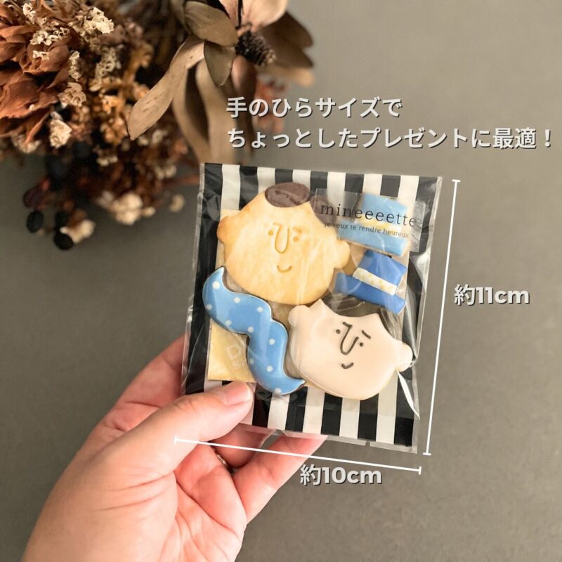 | 内容 | ・お父さんアイシングクッキー(にっこり笑顔のかわいいお顔) ・ヒゲアイシングクッキー(ブルーのドット柄でユニークに) ・ミニハットアイシングクッキー(おしゃれなアクセントに) ・お父さんバタークッキー(素朴でやさしい味わい) 各1枚ずつ サイズ:約10cm×11cm ※商品画像の状態でお届けいたします。それ以上の贈答用の個別ラッピングは行っておりません。ご了承ください。 |
