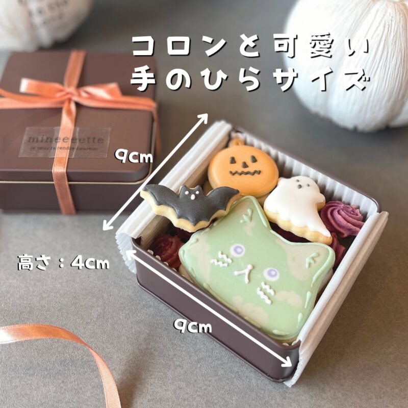| 内容 | *缶サイズ 横9cm×縦9cm×高さ4cm *内容量 ・ゾンビねこアイシングクッキー大1枚(約7cm×5.5cm) ・包帯ねこアイシングクッキー大1枚(約7cm×5.5cm) ・ジャックオーランタンアイシングクッキー大1枚(約6cm×6cm) ・がいこつアイシングクッキー1枚(約4cm×4cm) ・ミニかぼちゃアイシングクッキー1枚(約3.3cm×3.3cm) ・ミニおばけアイシングクッキー2枚(約4cm×3.3cm) ・ミニコウモリアイシングクッキー2枚(約4.7cm×2.3cm) ・むらさき芋絞りクッキー5枚・コウモリココアクッキー2枚 合計16枚 (一枚一枚丁寧に作らせていただきますが、手作りの為、デザインや色に少し違いが生じることがあります。ご了承ください。) |