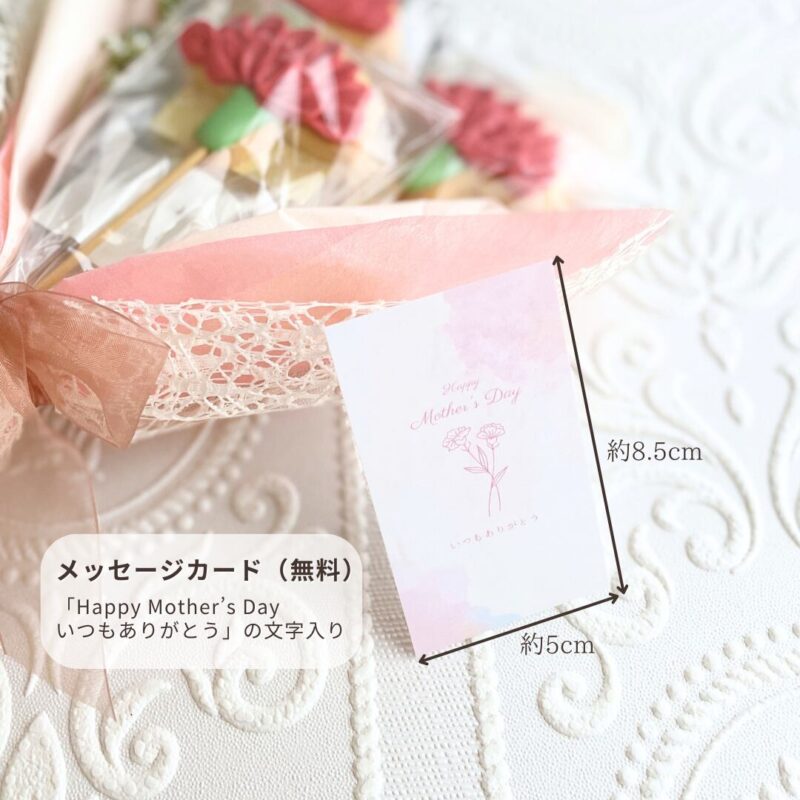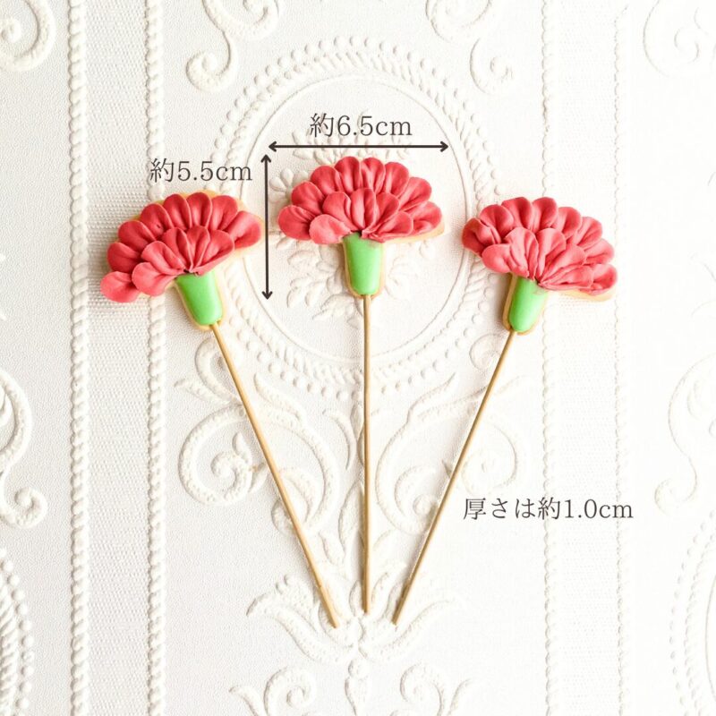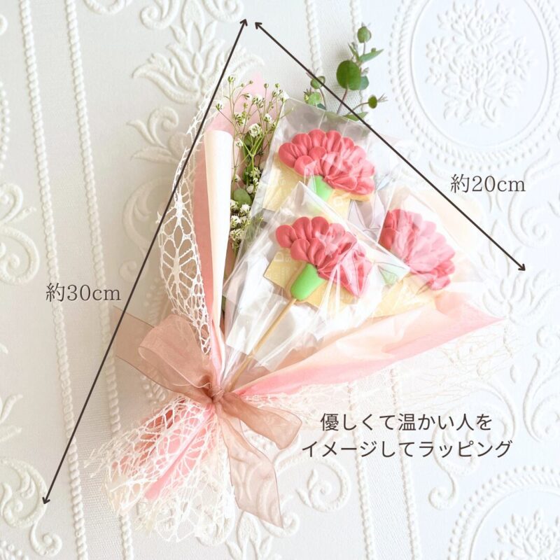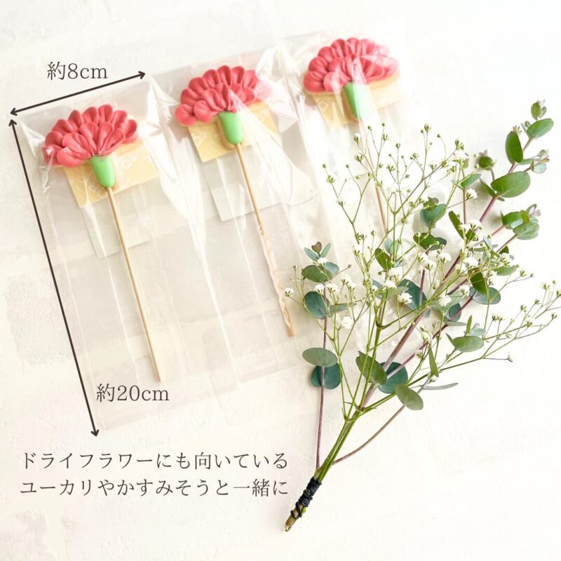 | 内容 | ・カーネーションアイシングクッキースティック レッド3本 ・生花 ・メッセージカード(無料) ・mineeeetteロゴ入り紙袋(無料) サイズ:約30cm×20cm 重さ:約85g ※スティックの先端にはお気をつけください。 ※生花はドライフラワーにも向いているユーカリ、かすみそうをメインに使用しています。季節によっては種類が異なることがございます。ご了承ください。 ※商品画像の状態でお届けいたします。それ以上の贈答用の個別ラッピングは行っておりません。ご了承ください。 |